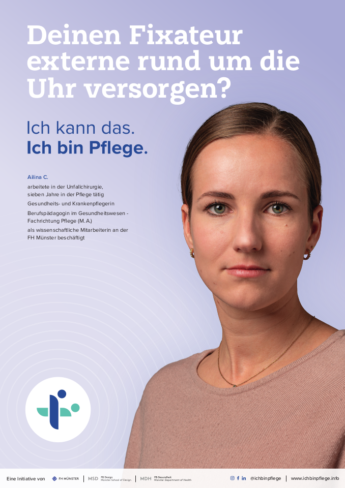 In Zusammenarbeit haben die Fachbereiche Design und Gesundheit an der FH Münster eine Social Awareness Kampagne für die Pflege entwickelt. Die Kampagne, die am 21. Juni 2023 veröffentlicht wurde, hat das Ziel die Komplexität von Pflege deutlich zu machen und in der Gesellschaft mehr Anerkennung und Bewusstsein zu schaffen. „Durch Interviews von Pflegefachkräften erhältst Du Einblicke in die anspruchsvollen Tätigkeiten und die unterschiedlichsten Versorgungssettings.“ Starke Pflege unterstützt die Aktion und wird über ihre Kanäle für die Verbreitung der Motive sorgen. Mehr zu erfahren ist über die Webseite der Kampagne. Wie dort zu sehen ist, hat die Kampagne schon viele Gesichter, aber dabei soll es nicht bleiben, also: